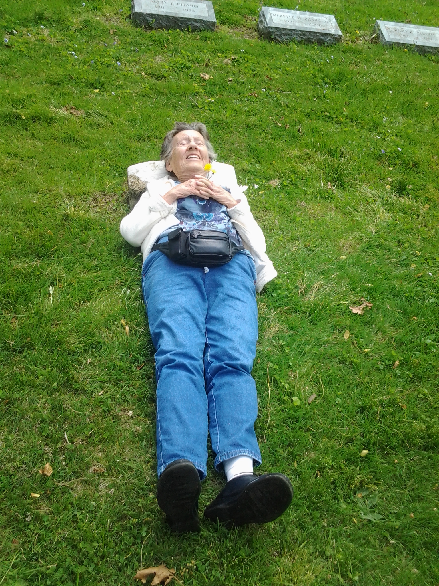 In the picture below she is checking out real estate in a cemetery.  She likes to be prepared and wanted to know if it would be comfortable.  Did you notice the fanny pack? She thinks she “can take it with her.”  I told her it would all just get burned up!