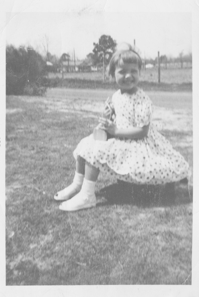 As far as I was concerned, sand was clean. Mud was dirty. Axle grease was dirty. Chicken poop was dirty. Sand was white and dusted right off. It was not dirty. At any rate, Mother filled the tub with water and sprinkled in a tub with Tide Powder and plunged me in. That was what passed for bubble bath at our house. I would have been content to spend the afternoon there, but she washed my hair and hurried me out, ruining another good time. Then she brushed my stick straight hair and stuffed me in a fluffy petticoat, a white fluffy dress with red and blue polka-dots, white socks, and sandals. Worse yet, I had to submit to a photo session. Mother was a novice with a camera making me pose forever, staring into the sun. She’d gone to a great deal of fuss making matching dresses for me and Phyllis for Easter and was extremely proud of the effect. Too bad the confection was wasted on me. When she’d said Easter outfit, I’d envisioned a cowboy getup.
