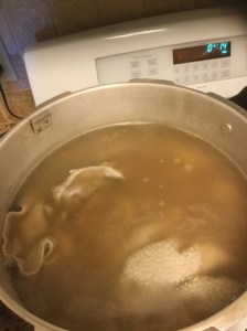 So I bleached them. They went from dingy gray to a dull hen poo poo muffledy dun.  Those towels were disgusting, sort of like they had been wiping shoes, smearing mascara, washing the car, and wiping up dog vomit with.  I tolerated them for a while, then checked the internet for a solution.  I needed to boil them in a solution of dishwasher detergent, vinegar, borax and detergent.  Sounded like a lot of trouble, but I really wanted them white again. I mixed the concoction right up and put my towels on to boil.  I boiled them for about thirty minutes, frequently punching them down.  I believe this was the high-tech method used up until folks got washing machines.  The water turned an ugly brown.  It must be working!