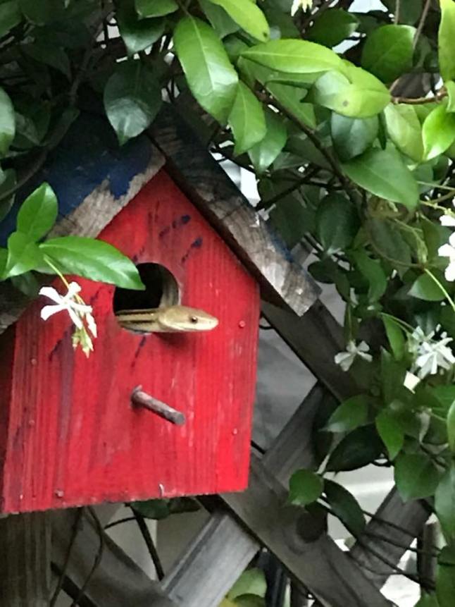 At first glance I thought this snake was so cute until I realized what his business in the birdhouse was.
