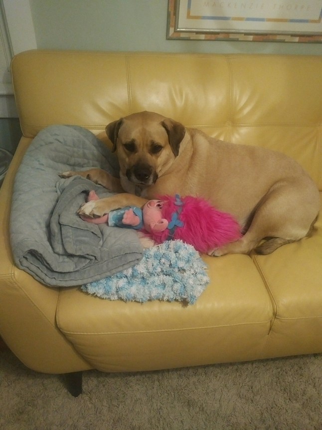 The mail carrier has once again been vanquished, but as you can see, Though he has blankets, poor Croc is uncovered. He has, however, acquired the baby’s favorite doll to comfort him. He covets her snugglies, and given the opportunity, snitches them. This fearsome beast is all that stands between us and the USPS. Of course, he is not allowed on sofa.