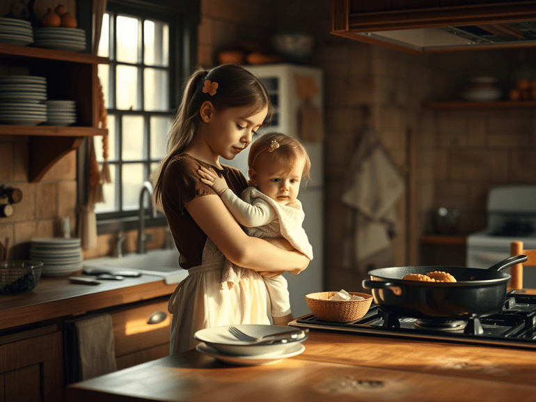 “Oh no! You woke the baby. Now I won’t get to eat. How many times do I have to tell you not to slam that door!” Mother tossed her dish towel on the counter and got the baby. “Lynn, do you want to finish getting supper on the table or take care of the baby?”