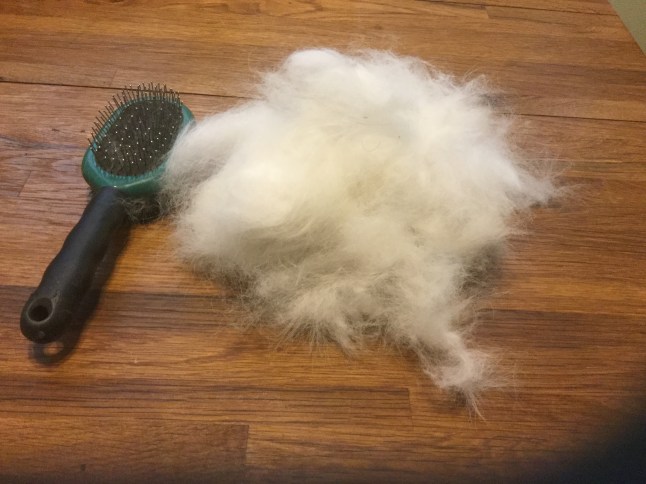 Above you can see my American Eskimo Dog, Buzzy. He is a pure delight, except for shedding. I brush him several times a week. Pictured below is the pile of hair I brushed out this morning. The fibers are long, silky, and soft as rabbit fur. I have long thought it would make a beautiful sweater. I believe I could collect enough in a few weeks, but am not industrious enough to learn spinning. I need to get to work. I am wasting a valuable renewable resource.