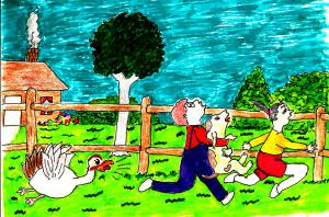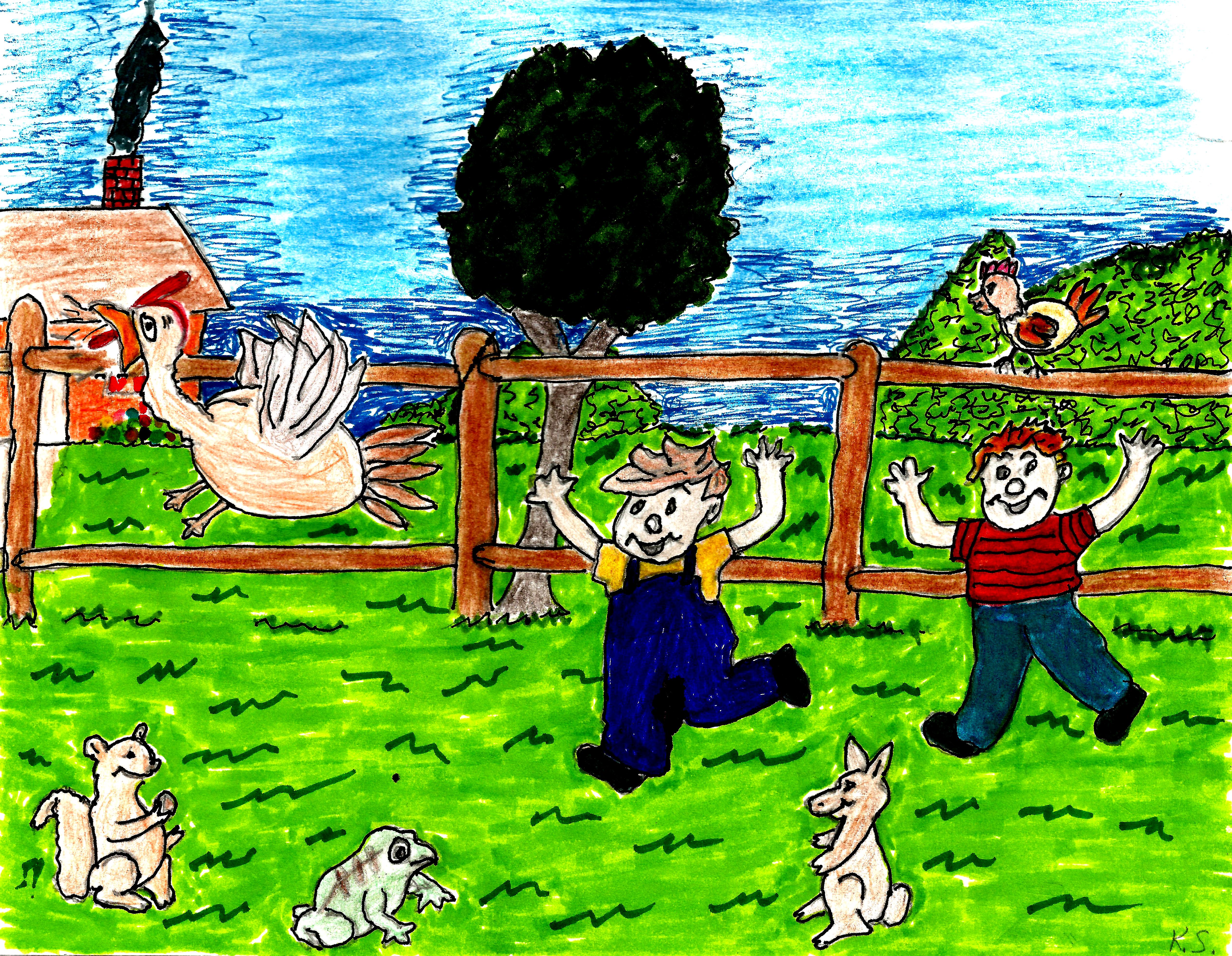 Before too long, we saw the Nickerson kids, the meanest kids in the neighborhood, headed for the chicken yard. Mother couldn’t wait to see Tom get them. Sure enough, Ol’ Devil Tom jumped out from behind a shed on jumped on the biggest boy, Clarence. Clarence yelped and ran. The other boys were right behind him, swatting at the turkey. Unlike us, they didn’t run out with their tails tucked between their legs. They launched an all-out attack on Tom, beating him with their jackets, sticks, and whatever they could grab. They chased him until they were tired of the game. Tom never chased any of us again, but Mother never got around to thanking the Nickersons.